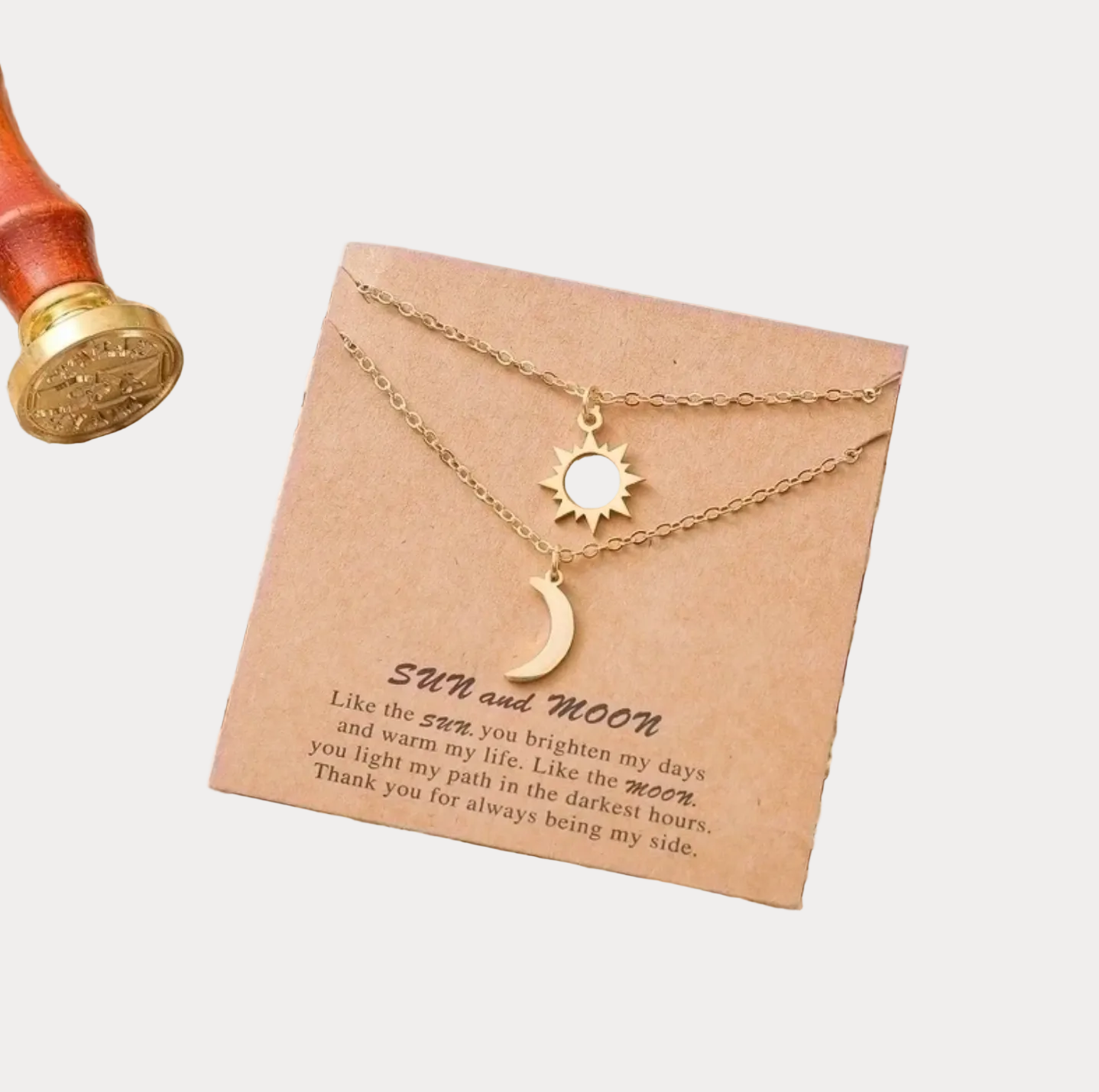 Perfect for everyday wear or as a heartfelt gift for someone special, this set comes beautifully presented with a card that reads: "Like the sun, you brighten my days and warm my life. Like the moon, you light my path in the darkest hour. Thank you for always being by my side." Whether you're treating yourself or gifting to a loved one, this necklace set carries deep meaning and timeless style.