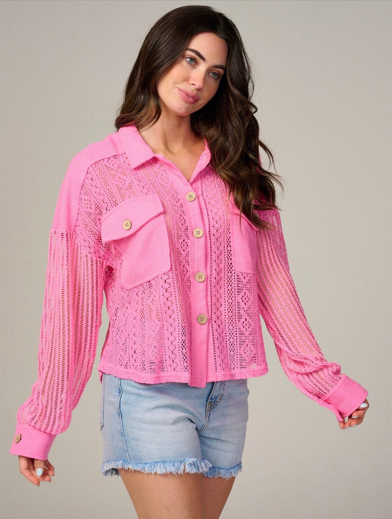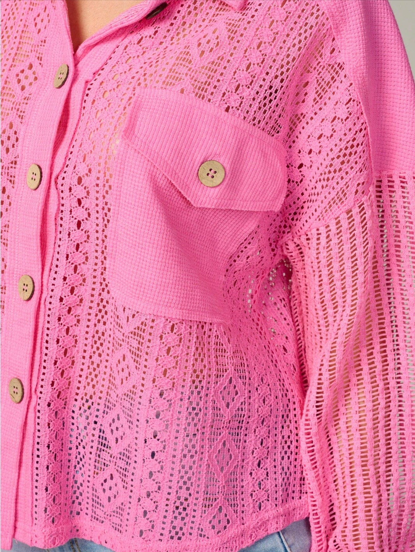 Make a bold statement this Valentine's Day with this stunning hot pink crochet knit button-up blouse. Featuring intricate open-knit detailing and a vibrant pink hue, this piece is perfect for celebrating love in style.