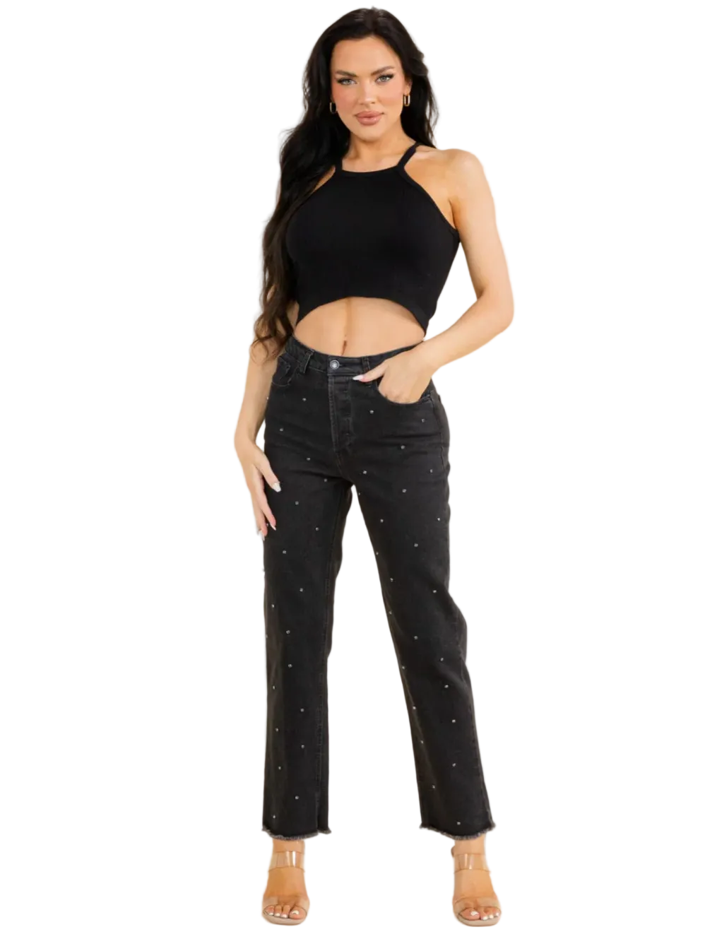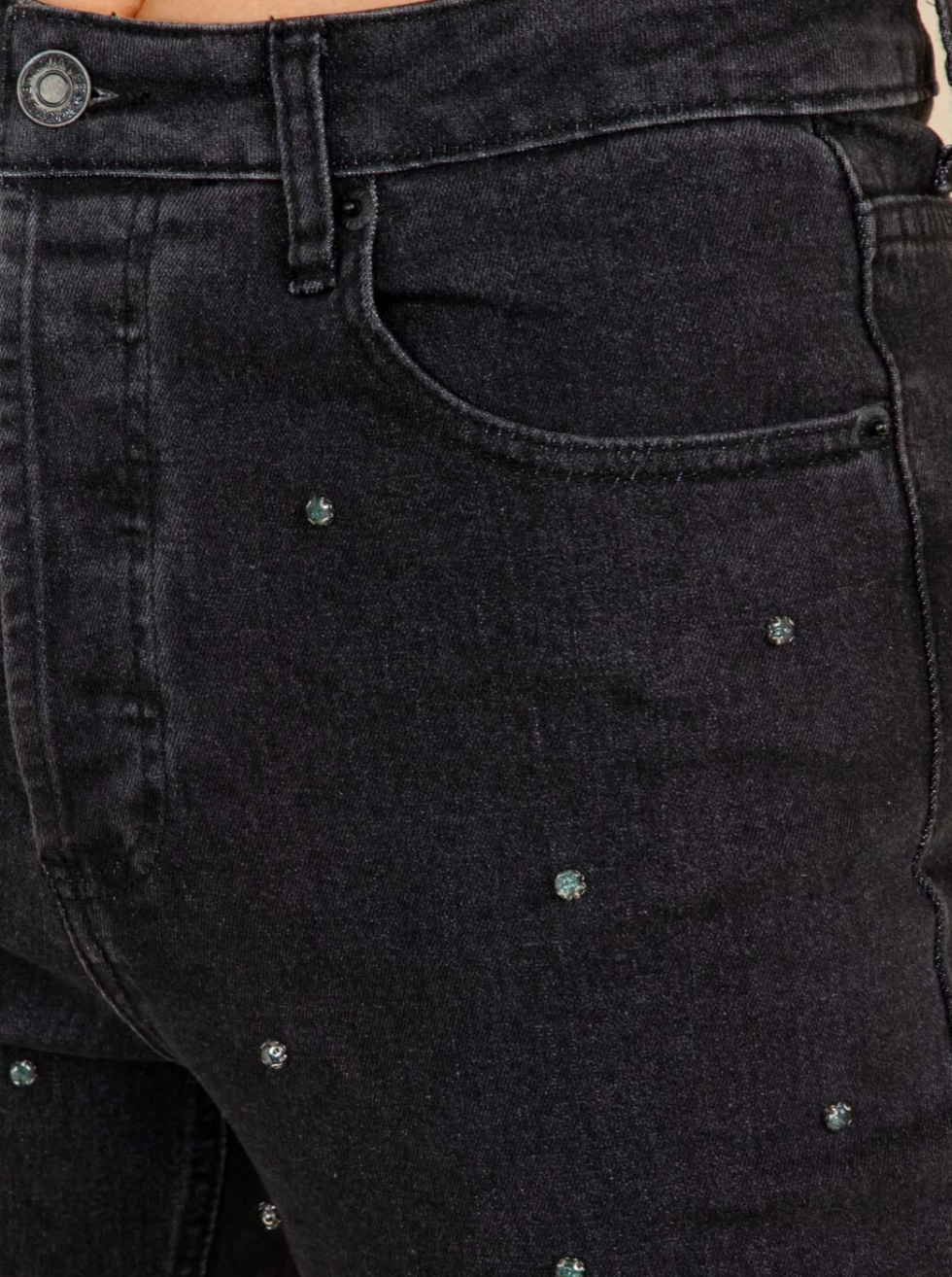 Add edge to your denim collection with these statement-making studded wide leg pants. Featuring scattered rhinestone stud details and a raw hem finish, these black denim pants combine classic wide leg styling with contemporary embellishment for a look that's both bold and sophisticated.