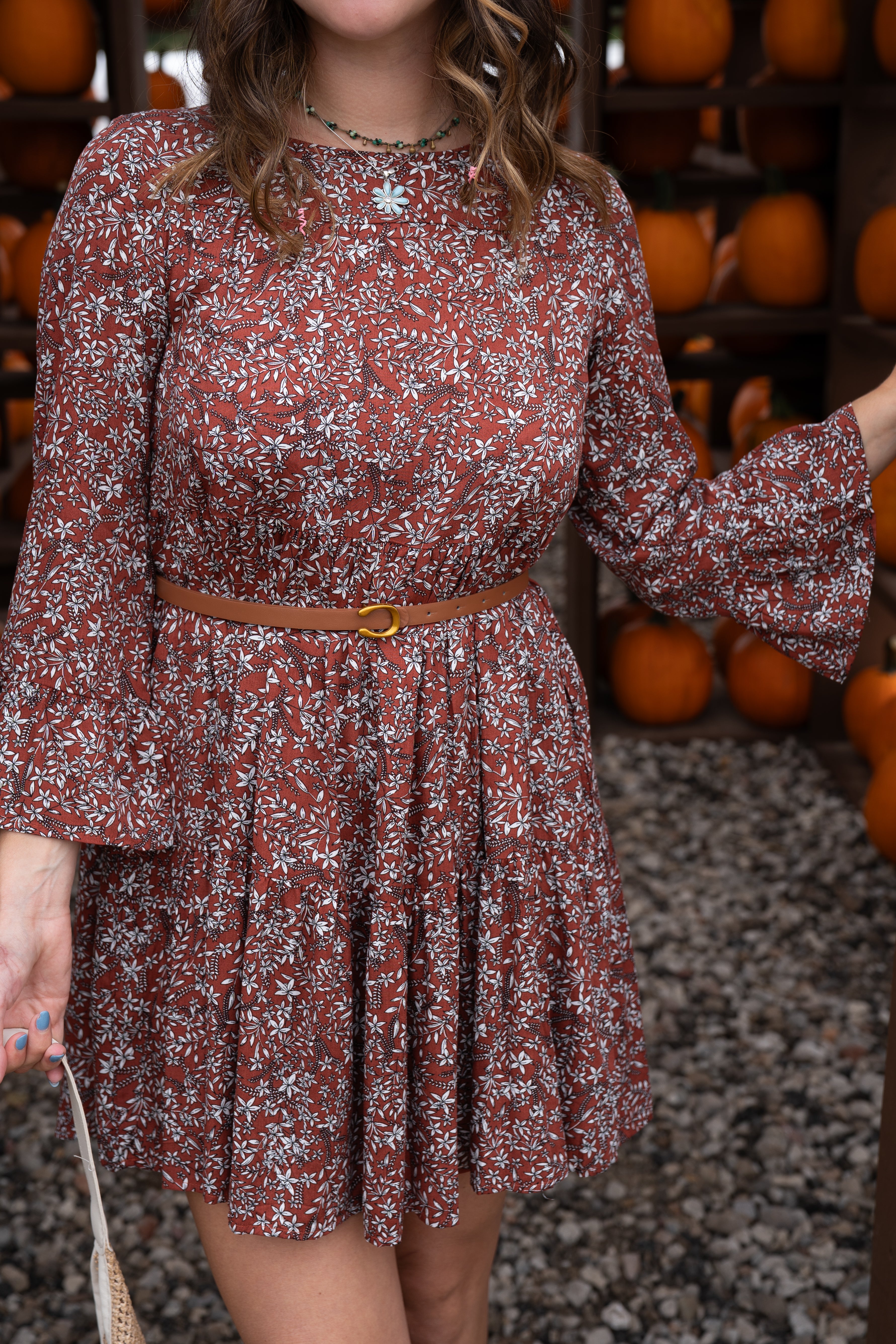 Embrace effortless boho style in this rust-brown floral swing dress featuring long sleeves, a relaxed flowy fit, and a lightweight feel perfect for fall layering. Pair it with boots and a hat for a chic rustic vibe or dress it up with jewelry for a night out. Shop this timeless bohemian mini dress online or in-store at Eclipse Apparel.