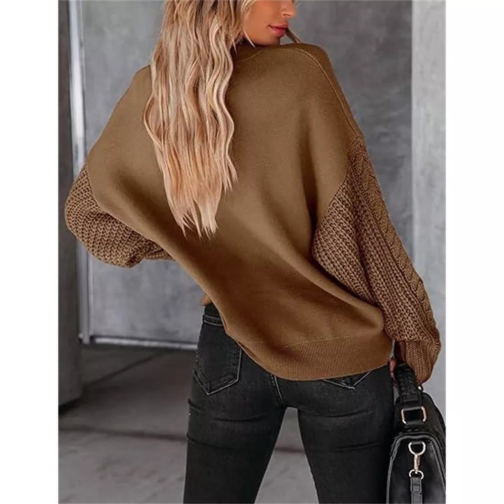 Effortlessly chic and cozy, this neutral knit sweater features textured cable sleeves and a relaxed silhouette for that elevated everyday look. Its warm camel tone pairs perfectly with denim, faux leather, or tailored trousers — making it a fall and winter must-have. Style it with a wide-brim hat and gold jewelry for that polished, influencer-inspired vibe.