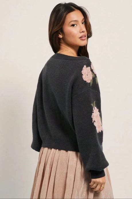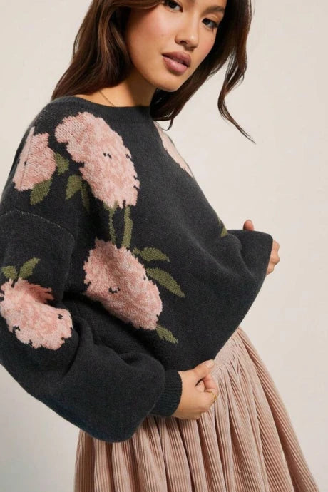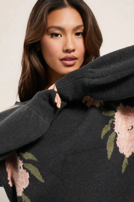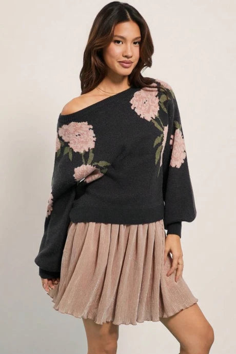 Cozy meets chic in this off-shoulder floral knit sweater. Designed with soft blush floral accents on a dark charcoal base, this slouchy sweater gives a feminine yet relaxed vibe. Perfectly paired with pleated skirts or denim, it’s the ideal fall-to-winter transition piece that effortlessly blends comfort and style.