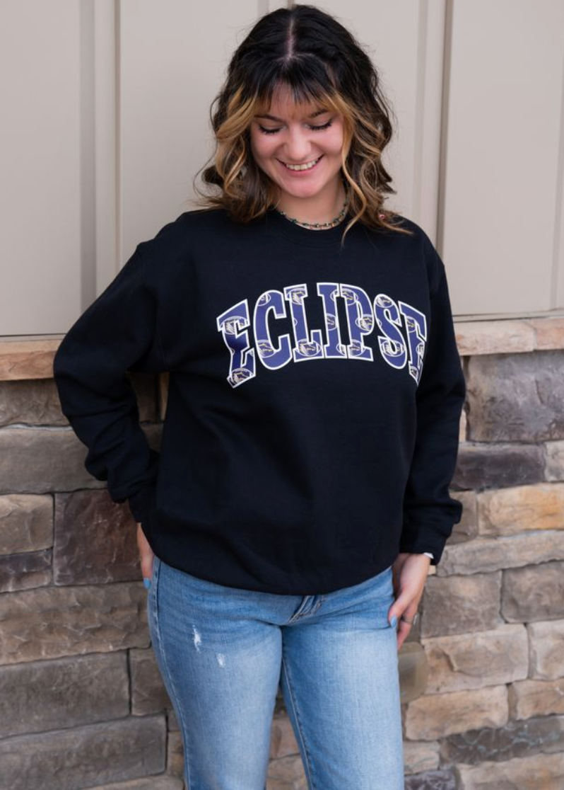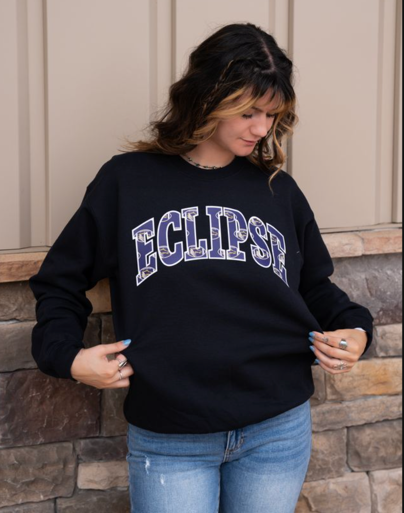 Rep Eclipse with Marlboro Mustangs spirit! 🐎 This black crewneck features our signature logo filled with the official Mustangs football pattern — a bold nod to our hometown team. Perfect for game days, tailgates, and repping your roots in style.