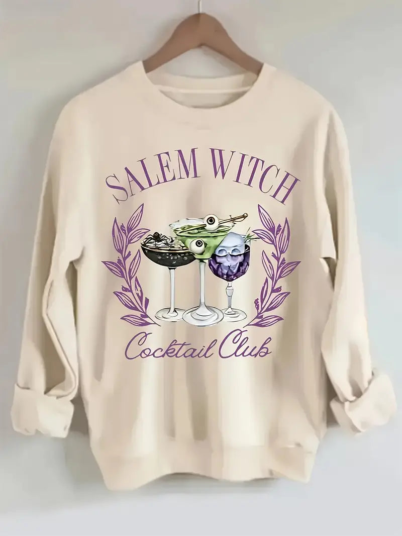 Raise your spirits (literally) with our Salem Witch Cocktail Club Crewneck — the perfect mix of cozy, spooky, and sassy. This cream-colored sweatshirt features a whimsical graphic of eerie cocktails topped with eyeballs and skulls, surrounded by a witchy laurel design and bold purple lettering.