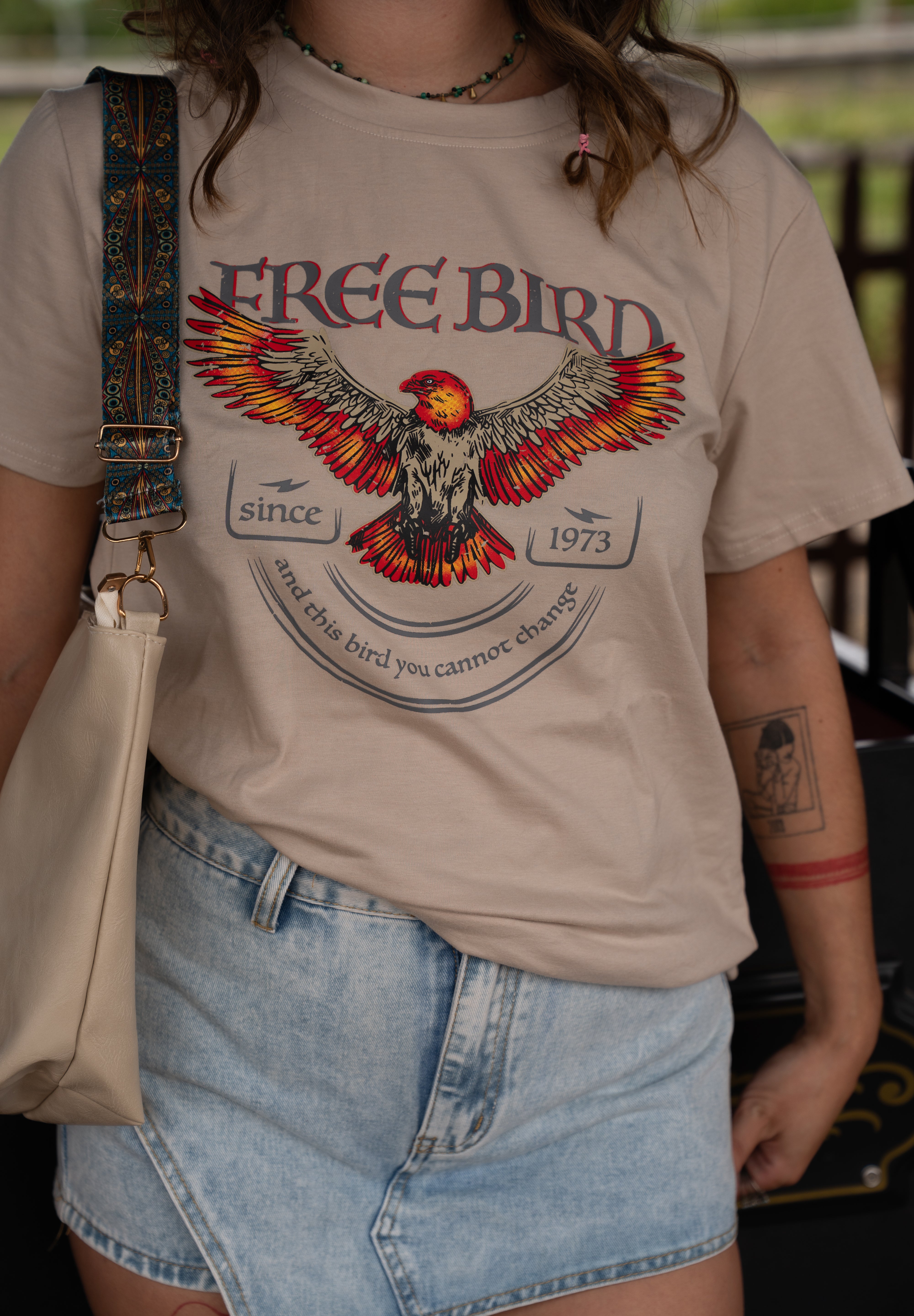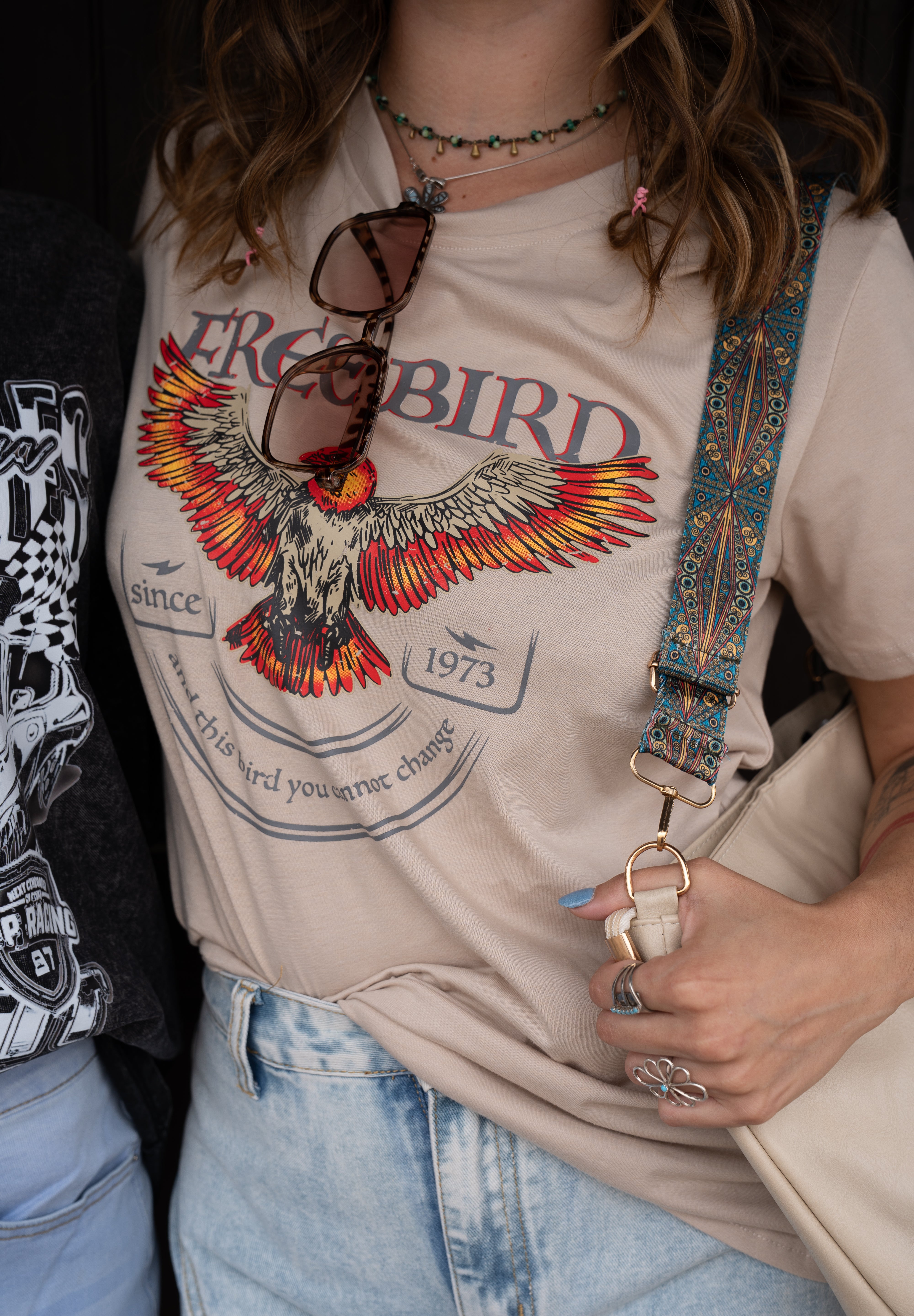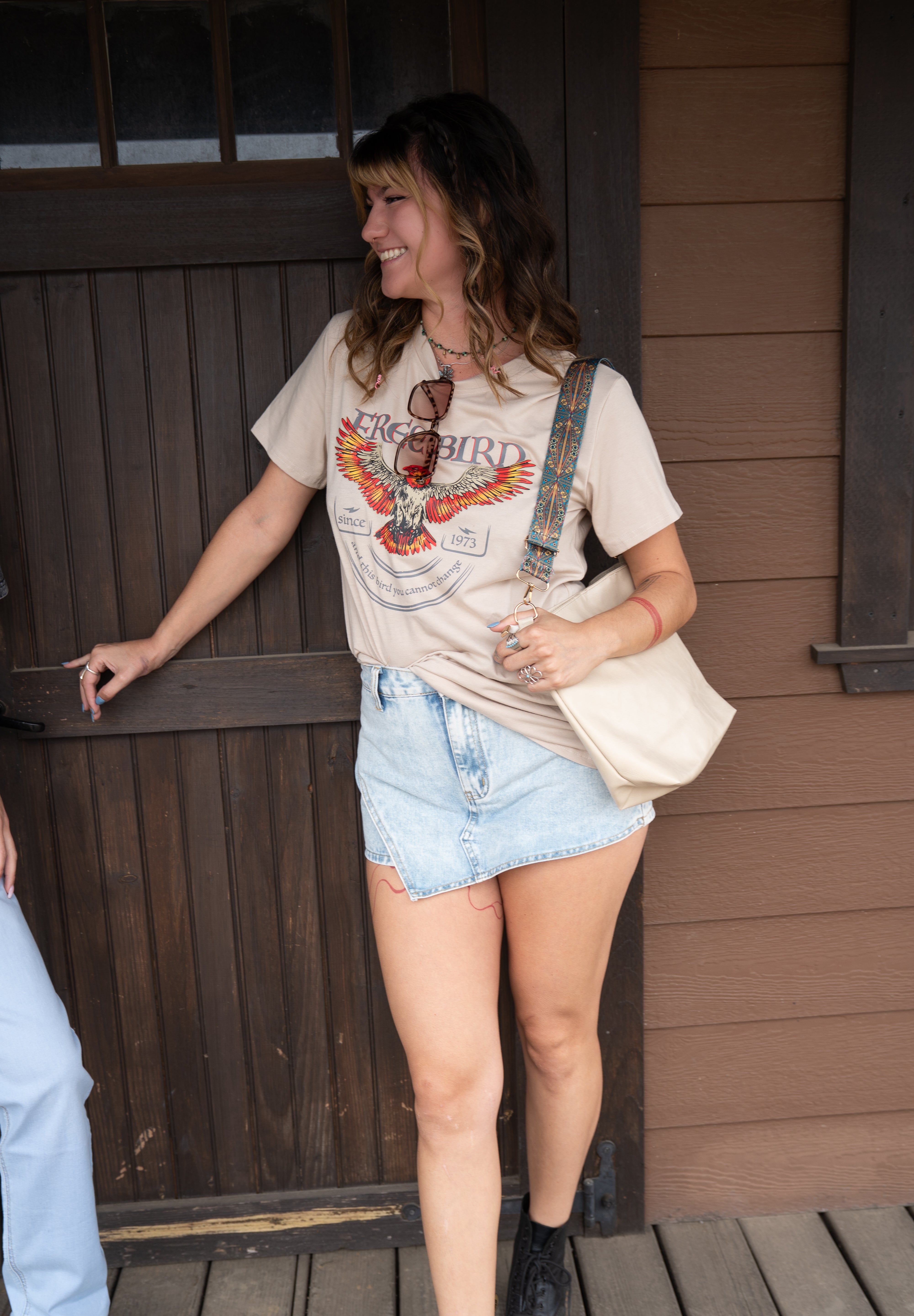 Channel vintage rock energy and effortless cool with the Soaring Spirit Tee. Featuring a bold graphic of a bird in flight and retro typography, this tee captures that free-spirited vibe you’ll want to wear on repeat. Designed on a soft, lightweight cotton blend with a relaxed fit, it’s perfect for pairing with denim cutoffs, leather jackets, or your favorite joggers.